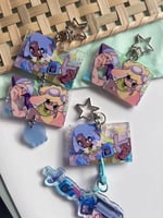 original splatoon character charms on a special glitter acrylic! gummy (blue) and pudding (yellow) ^.^